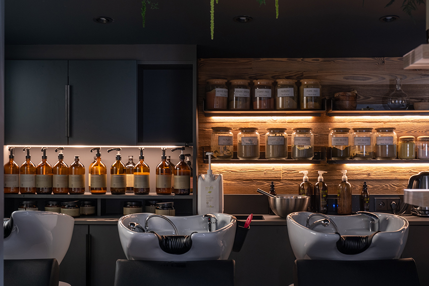 L’agence a rénové un salon de coiffure, proposant une expérience singulière dédiée à la coloration de cheveux par pigments naturels et à la détente.