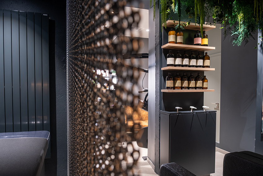 L’espace shampooing devient un moment de relaxation, où plusieurs scénarios d’éclairage permettent le massage du cuir cheveux ou le lavage. L’ensemble de l’agencement réalisé sur mesure répond précisément aux gestes quotidiens des professionnels. Une attention particulière a été portée sur la mise en valeur des produits, des pigments de coloration, des huiles de soin…